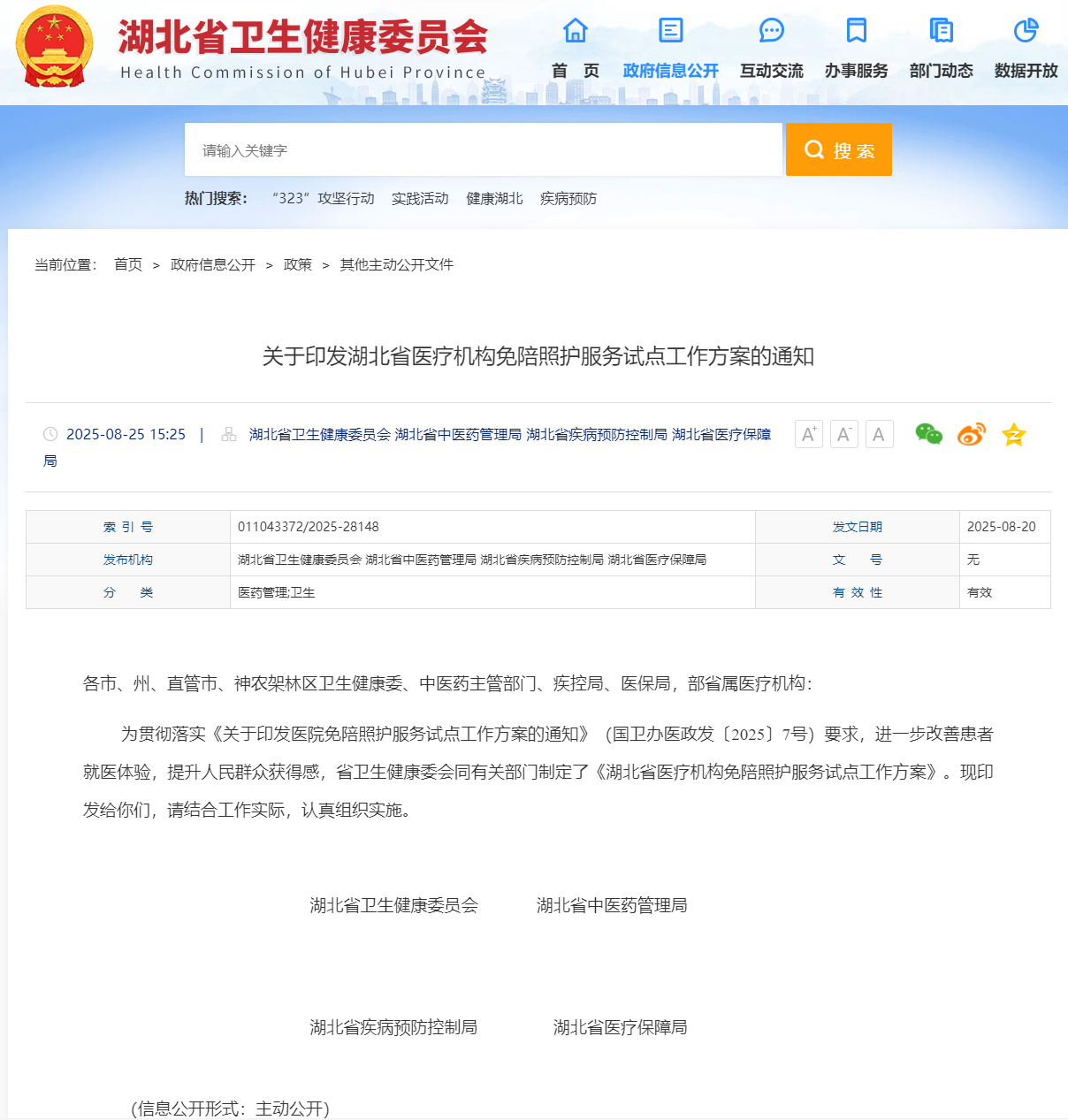 省卫健委介绍,开展医疗机构免陪照护服务试点,是湖北省深化医药卫生体制改革的重要实践,也是积极应对人口老龄化、优化医疗服务供给的关键举措。